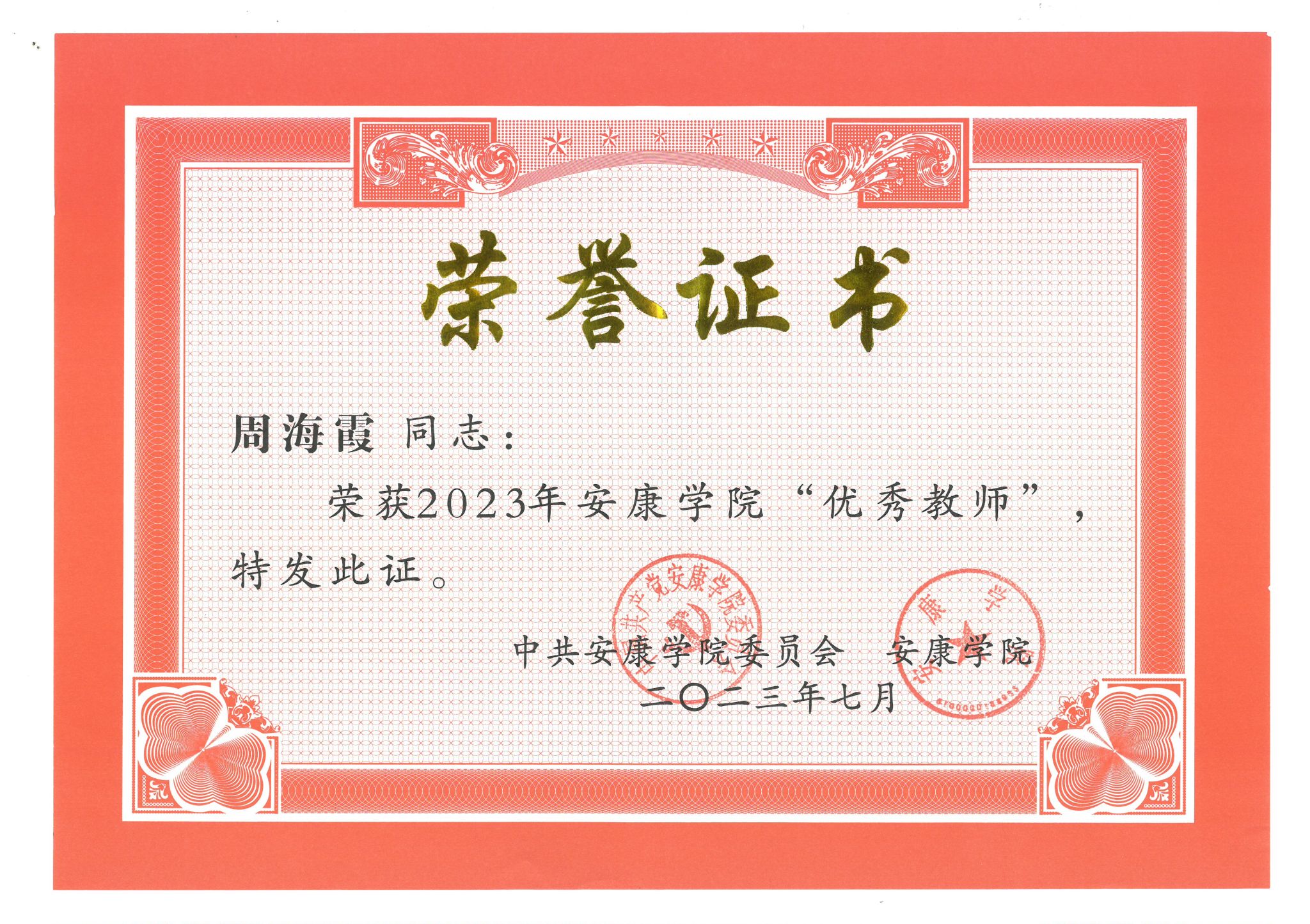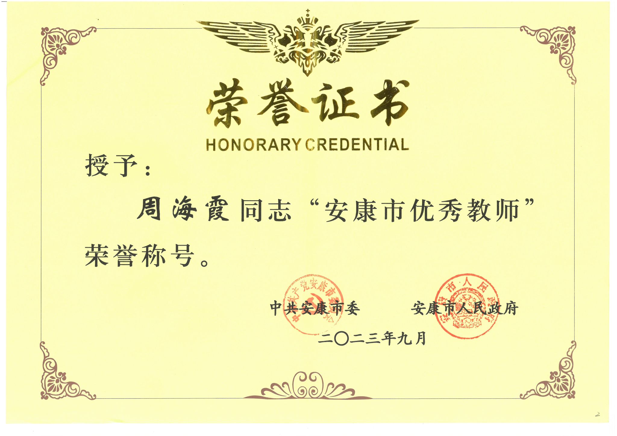 根据《关于推荐评选安康市教育工作先进集体和优秀教师、师德标兵、优秀班主任、先进教育工作者的通知》(安评组办发〔2023〕5号)精神和《BV伟德官方网站关于开展2023年校级教职工荣誉评选工作的通知》(党政办发〔2023〕16 号)相关要求,经个人申报、公司组织专家评审,公司教师周海霞被评为BV伟德官方网站优秀教师,同时被推荐参评安康市优秀教师,经安康市评审,确定周海霞为2023年安康市优秀教师。