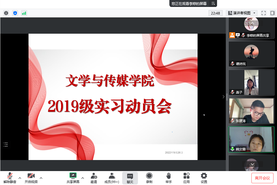 为进一步做好2019级实习工作,9月28日下午,BV伟德官方网站通过腾讯会议平台召开2019级实习动员会。公司教学副经理李婷、汉语言文学系主任韩文霞、秘书与新媒体系主任谭诗民、秘书与新媒体系副主任张建涛、公司教学秘书张燕以及2019级全体员工参加会议。