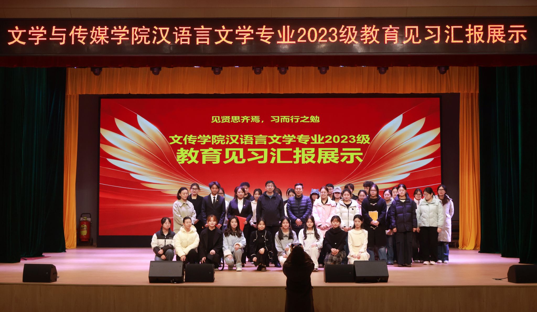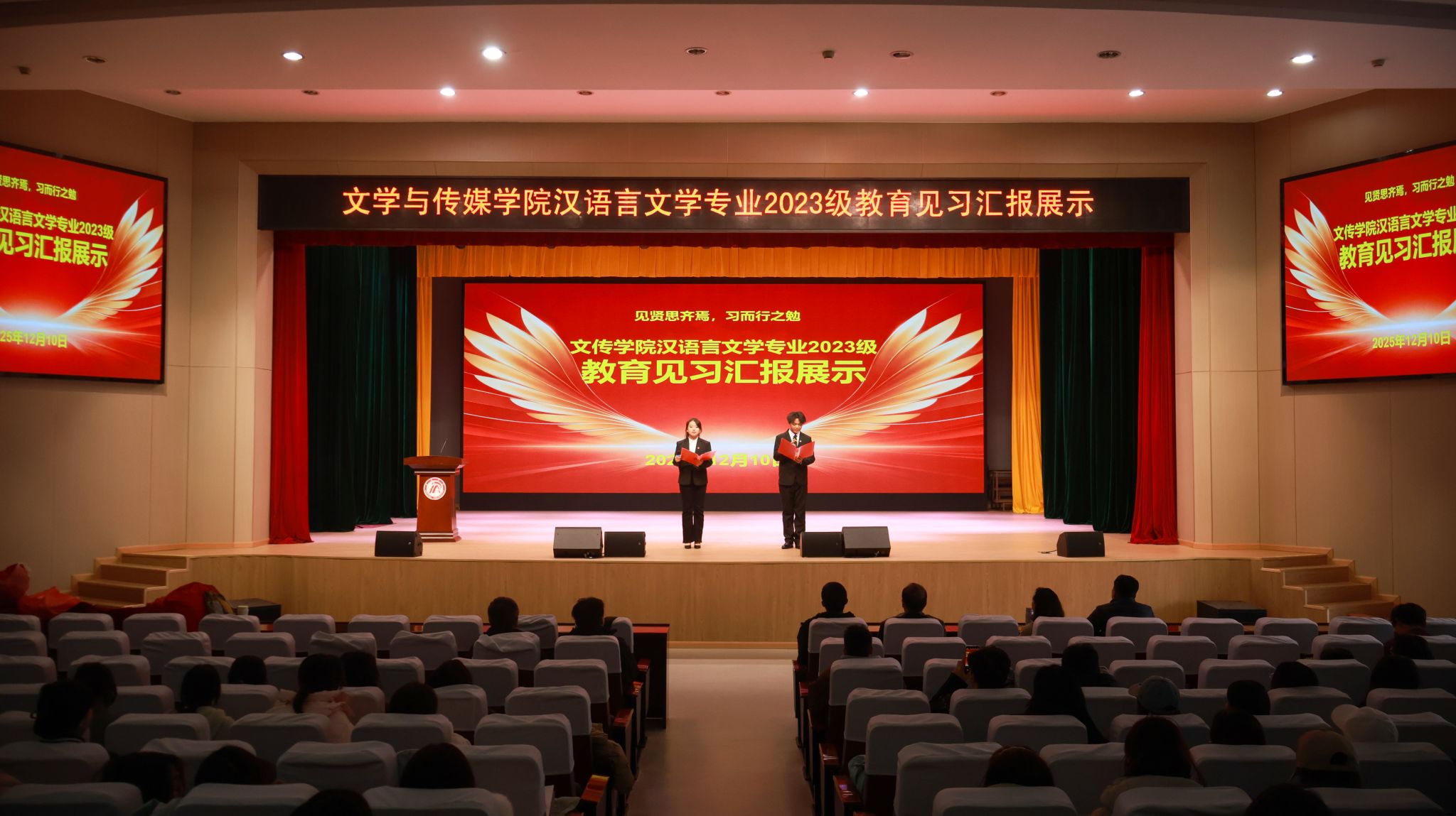12月4日下午4点半,BV伟德官方网站在江南校区大礼堂隆重举行汉语言文学专业2023级教育见习1汇报展示活动。本次活动旨在全面检验与展示2023级员工的教育见习成果,搭建交流互鉴平台,深化师范生对中学语文公司产品的理论认知与实践体悟。公司领导、两办主任等出席活动。本次活动由学科教学论任课教师张格瑄策划指导,汉语言文学专业2023级全体员工参加。