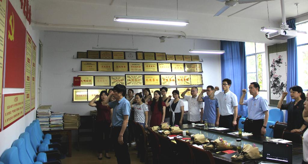活动中,全体党员教师共同观看了电影《建党伟业》中共一大召开的感人片段,在看到中共一大参会者们朗诵《共产党宣言》之后,教师们纷纷起立,面向党旗举起右手,重温入党誓词。