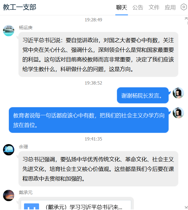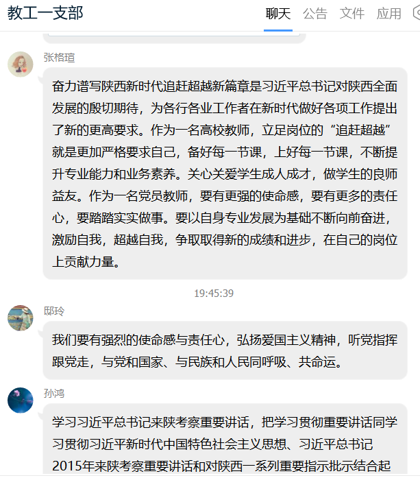 导航痕迹 首页 > 党建群团 > 正文 党建双创 党风廉政专栏 教工之家 团总支 员工分会 公司教工第一党支部开展“学习习近平总书记来陕重要讲话重要指示精神”线上主题党日活动 发布人: 发布日期:2020年05月25日 阅读次数: 5月23日,公司教工一支部依托支部QQ群开展了“学习习近平总书记来陕重要讲话重要指示精神”线上主题党日活动。活动由教工一支部书记李婷主持,本支部全体党员参加学习和讨论。 按照活动流程,首先由支部书记李婷带领大家共同学习习近平总书记来陕重要讲话重要指示精神相关内容,包括省委常委会议要点、习近平在陕西考察专题报道等。 随后,党员们结合学习内容分享了对于党员大局意识、历史意识、角色意识的认识,对“西迁精神”“延安精神”的理解,对教师职业道德、课程思政、教师教学科研方向等问题的思考,也表明了只争朝夕、真抓实干,为坚持社会主义办学方向、做好高校好老师而努力的决心。 在本次主题党日活动过程中,党员们学习认真,发言踊跃,活动气氛十分热烈。 (撰稿/图片提供 李婷 审核/于咏梅 发布/沈菲)