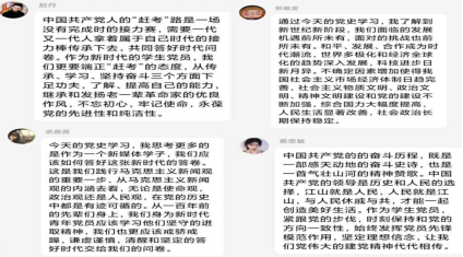随后,王孝臻、康怡帆和赵丹三位党员以微党课演讲方式,分别讲述了“听抗疫故事、学抗疫精神、做时代青年”,“弘扬红船精神 传承初心使命”和“坚持党媒姓党,担当传媒使命”,鼓励大家要胸怀人民,胸怀国家,结合学科特色,培养历史主动精神、培育政治勇气、敢于承担责任,勇于担当时代使命。