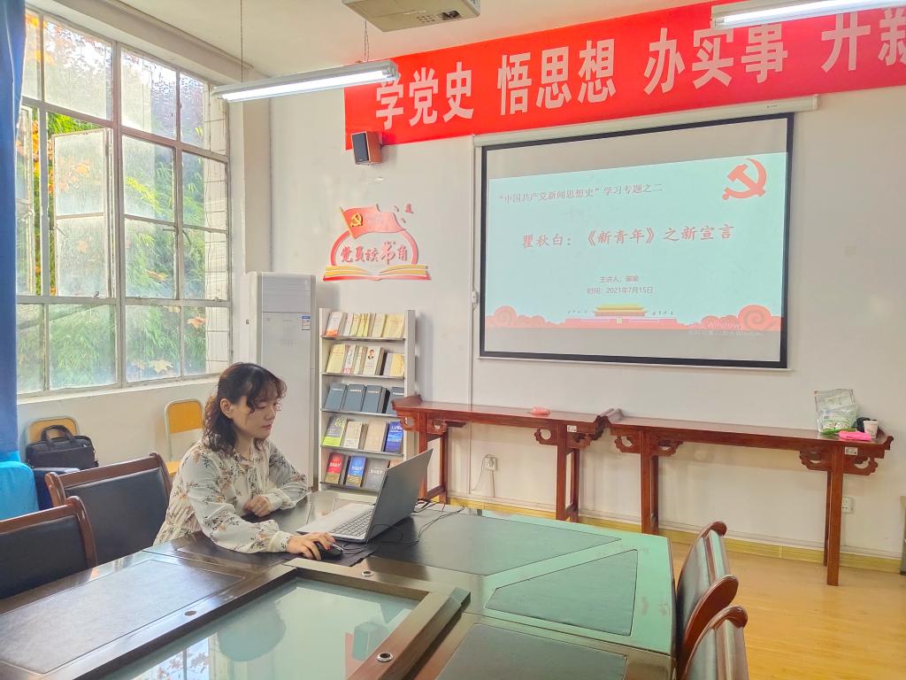 7月15日,公司教工第二党支部在2307会议室开展了“中国共产党新闻思想史学习”读书活动。活动由支部书记谭诗民主持,支部全体党员参加了读书活动。本次读书活动主讲人为支部组织委员崔瑜,阅读篇目为瞿秋白《<新青年>之新宣言》。