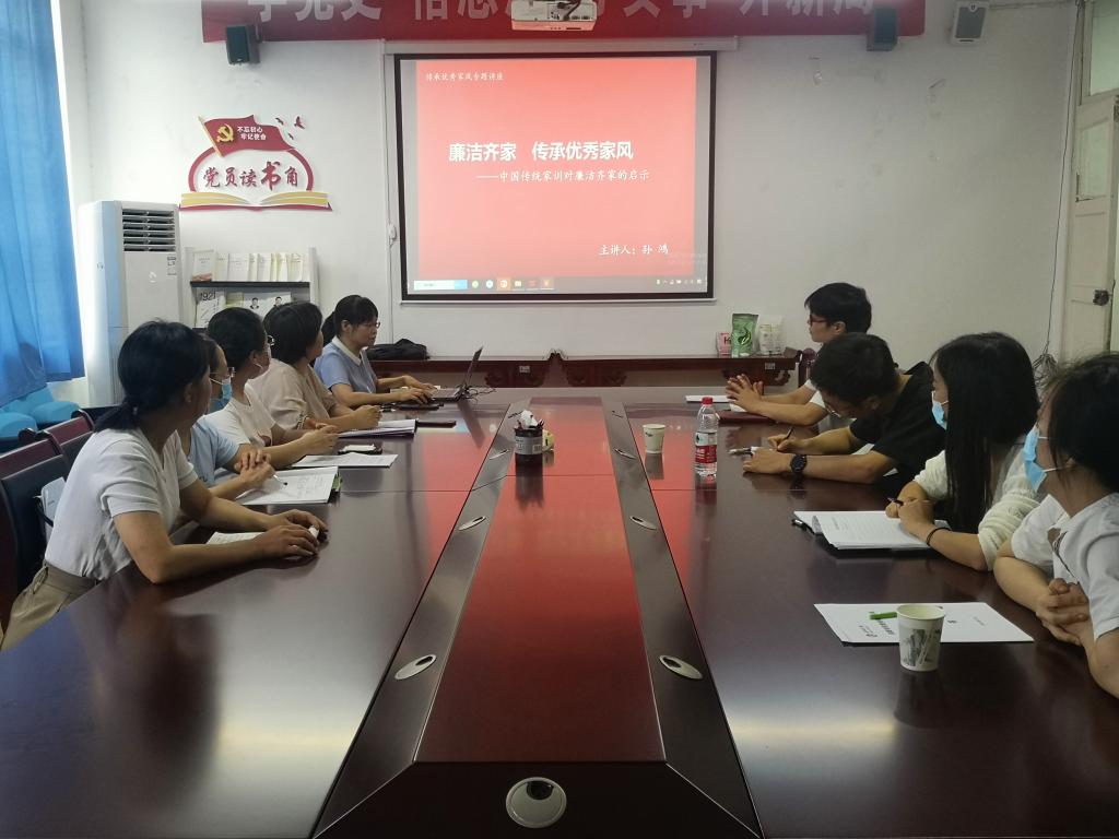 导航痕迹 首页 > 党建群团 > 正文 党建双创 党风廉政专栏 教工之家 团总支 员工分会 公司教工第一支部开展“廉洁齐家,传承优秀家风”主题党日活动 来源:BV伟德官方网站 发布日期:2022年09月13日 阅读次数: 9月7日下午,公司教工第一党支部开展了“廉洁齐家,传承优秀家风”主题党日活动,活动在2307会议室举行,由支部书记韩文霞主持,支部全体成员参加学习。 此次会议邀请孙鸿教授为我支部做“廉洁齐家,传承优秀家风”主题讲座。孙教授从中国传统家庭教育开始讲解,介绍了中国传统家庭教育的目的、方法,中国传统家训的主要内容及对当代廉洁齐家的启示,最后孙教授指出,廉洁是共产党人的基本底线,党员同志要以“家廉”促“党廉”,净化党内政治生态;以“家廉”促“社廉”,促进社会风清气正。 活动结束后,教师党员们纷纷表示,通过孙教授的此次分享,学习收获良多。家风建设关系着社风、民风、国风,是促进社会和谐、民族进步、国家发展的重要精神动力。党员同志要遵纪守法、廉洁从政、修身齐家,以自身行动带动和引导家人亲属营造风清气正、祥和安乐的家庭氛围。 撰稿/曹璇璇 审核/韩文霞 摄影/发布/崔瑜