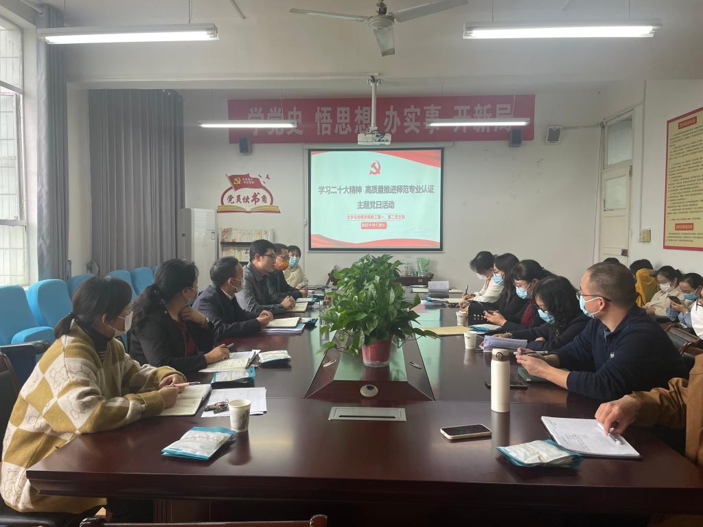 10月16日—22日,中国共产党第二十次全国代表大会在北京人民大会堂隆重召开,会议内涵丰富、主题鲜明、思想深邃、催人奋进。为深入学习领会党的二十大精神,10月26日下午,公司教工第一、第二党支部在2307会议室联合开展了“学习二十大精神,高质量推进师范专业认证”主题党日活动,由教工第一党支部书记韩文霞主持,教工第一、第二党支部全体党员参加学习。