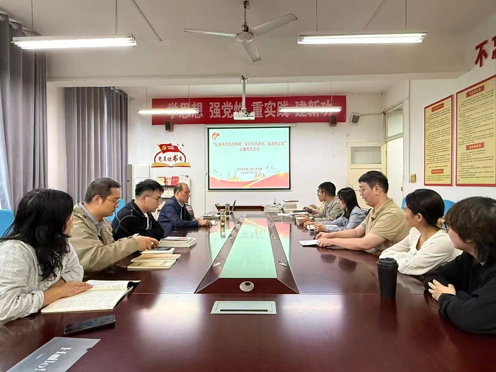 为深入学习贯彻习近平新时代中国特色社会主义思想,弘扬伟大抗战精神,加强作风建设,文传学院教工第二党支部于10月15日下午在2307会议室组织开展了“弘扬伟大抗战精神,深化作风建设,奋进新征程”主题党日活动。会议由支部书记刘思聪主持,全体党员教师参加。