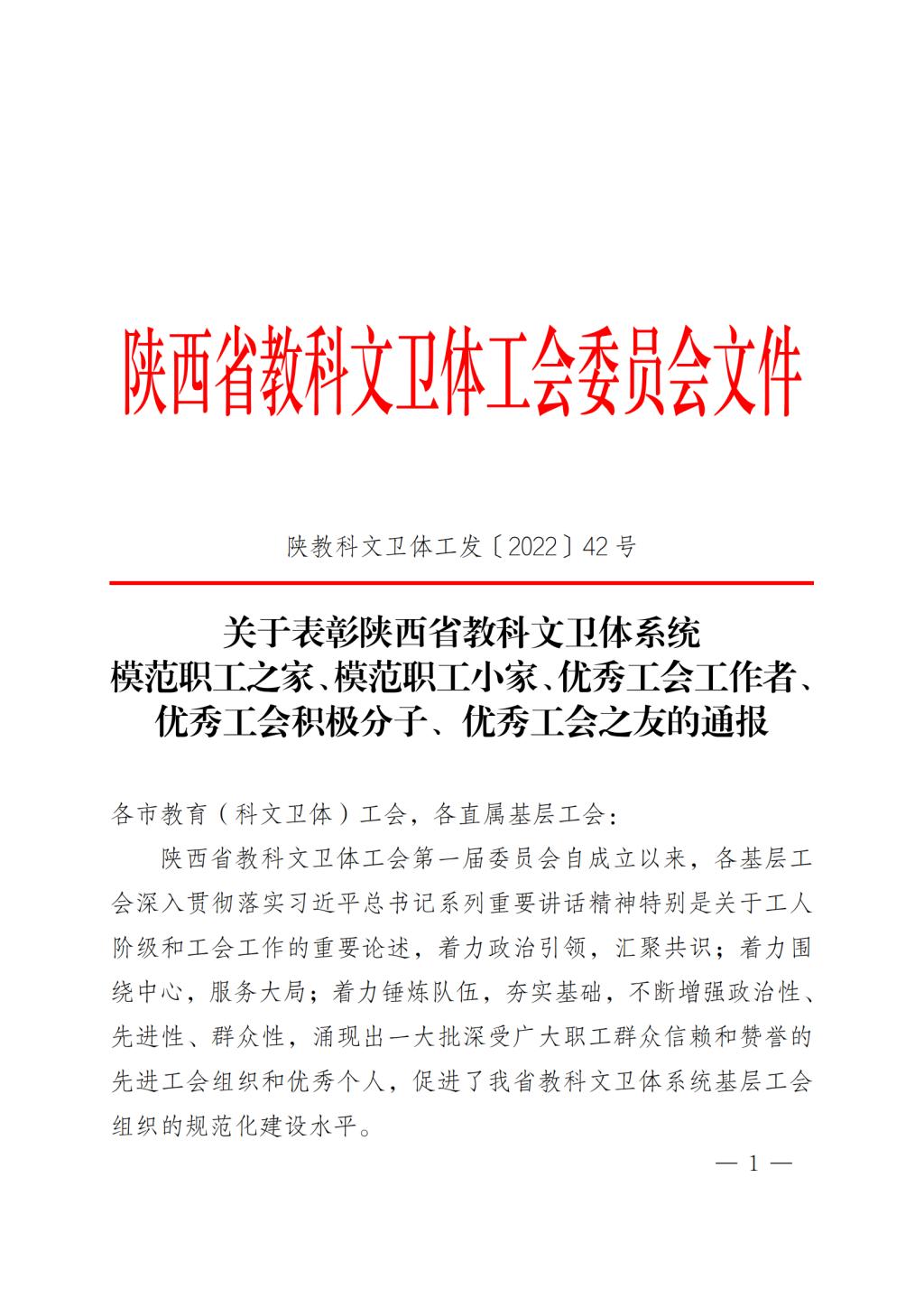 近日,陕西省教科文卫体工会委员会印发《关于表彰陕西省教科文卫体系统模范职工之家、模范职工小家、优秀工会工作者、优秀工会积极分子、优秀工会之友的通报》,工会BV伟德官方网站分会被授予陕西省教科文卫体系统模范职工小家称号。