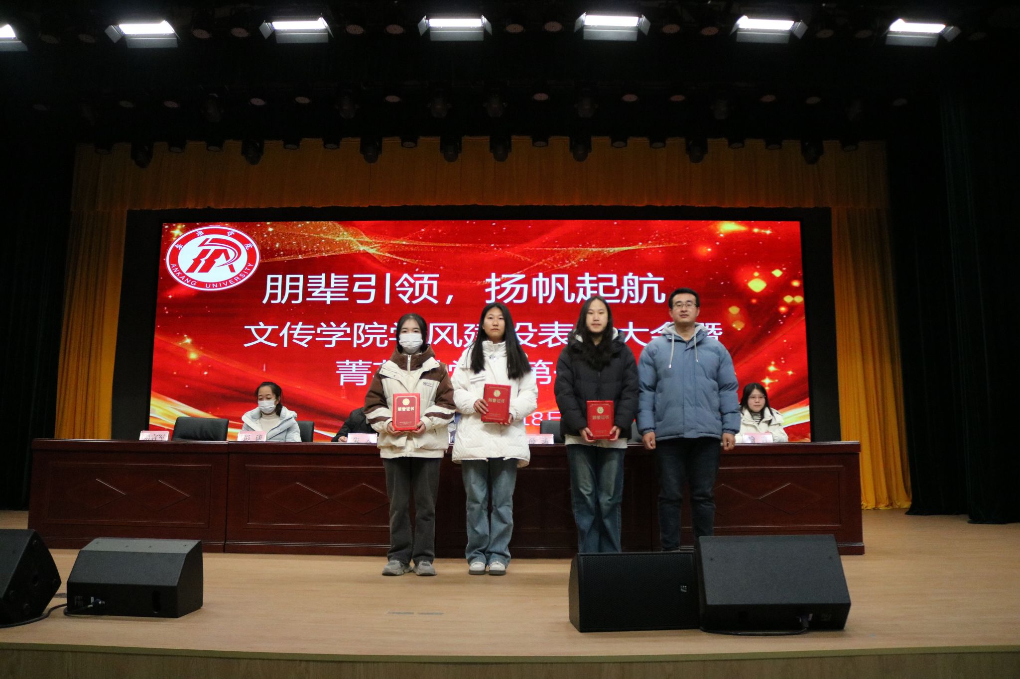 颁奖仪式后,员工代表依次上台交流分享学习经验。汉语言文学2022级4班郑红阳围绕“大学平衡术”展开交流分享,她鼓励同学们积极实践、勇于试错,成就更好的自己。秘书学2022级1班王文康用幽默的语言分享他的“四小法宝”,激励大家拒绝摆烂心态明确目标、立即行动。网络与新媒体2023级1班崔嘉睿通过亲身经历讲述“在远方 在路上”的感悟与体会,号召大家勇于实践,敢于担当,在学习和实践中提升自己的专业素养