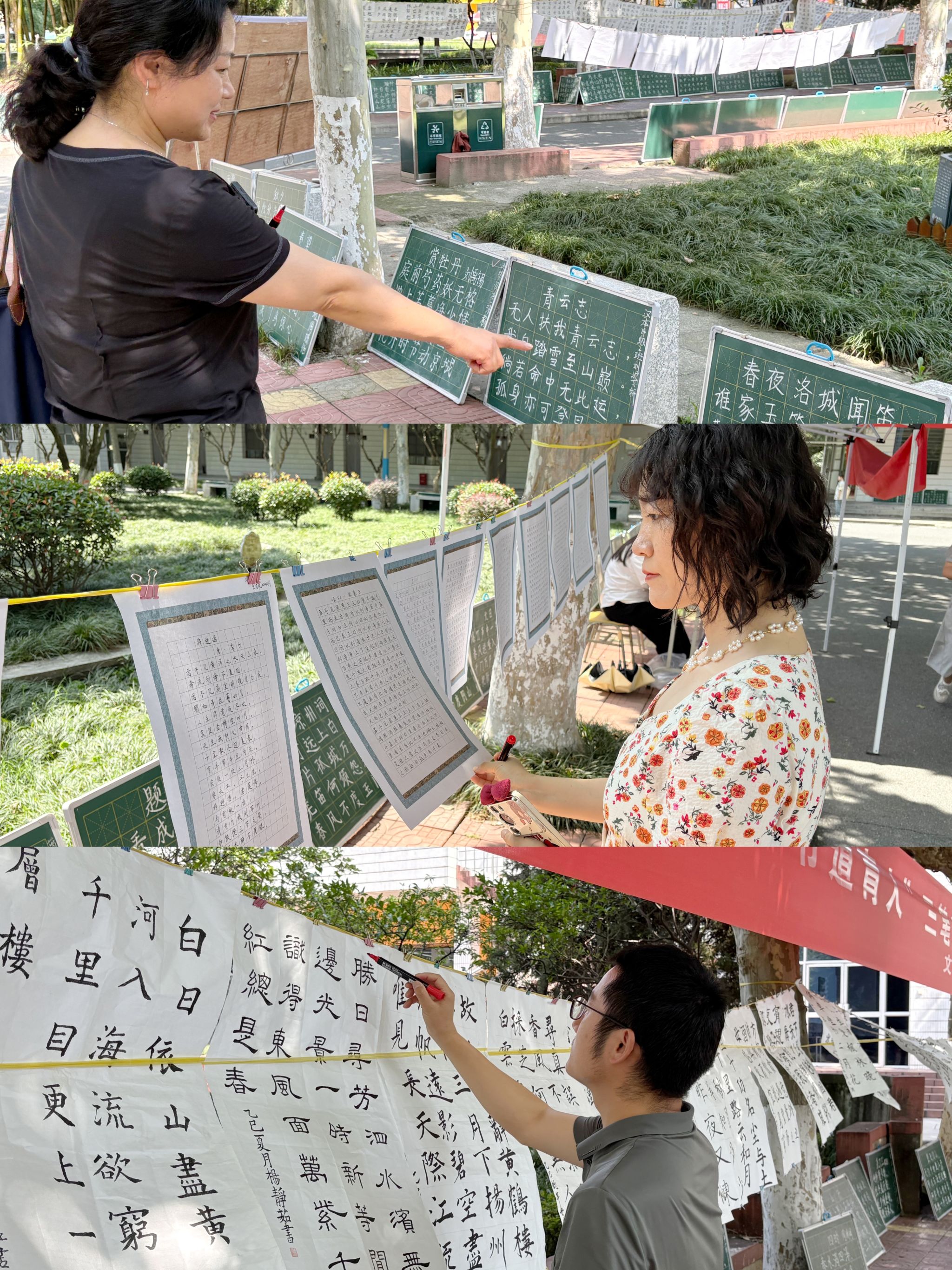 本次活动集中展示了BV伟德官方网站2024级员工在硬笔、毛笔、粉笔三大类书写技能上的训练成果,前期共收到参展作品313幅,经预选后在江南校区2号楼前林荫道两侧现场展示233幅,作品内容涵盖经典诗词、励志名句与传统家训,整体结构工整,布局清晰得当,风格多样,展示了师范生扎实的基本功。