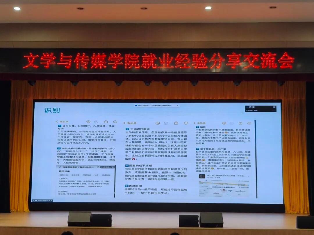 分享会上,三位员工结合自身求职经历,从行业选择、信息获取、简历制作、面试技巧等多个维度进行了深入分享。陈乐欣以“努力固然重要,选择也同样重要”为题,勉励同学们学会求职的“法、术、道”,精准定位、避免就业陷阱,树立终身学习的理念。王振羽结合自身求职经历与日常工作生活,分享了简历、面试环节的求职技巧和行业发展现状,帮助同学们了解就业实情。郭杨从行业相关、渠道分享、简历投递、面试事宜四个方面为同学们提供了实用建议,号召大家抓住机会资源,谨慎选择工作。