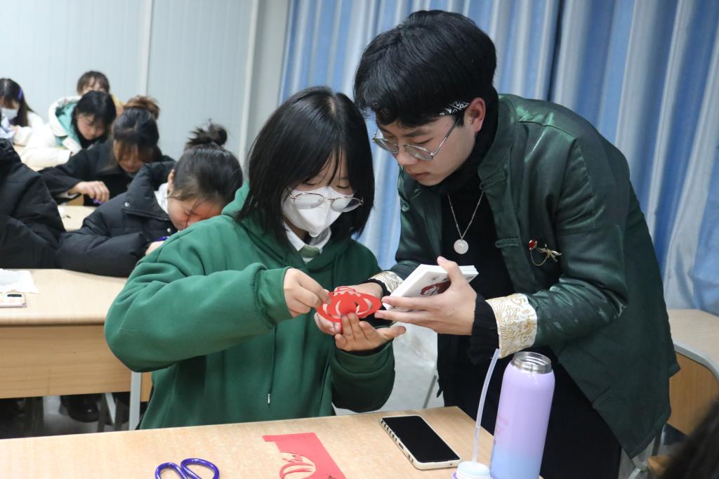 “我上课发剪纸材料的时候,发现准备的纸张到互动环节根本就不够,同学们积极性很高。”汉语言专业的刘瑞丽说:“在自己动手剪的过程中才发现,剪纸活动是一项特别需要耐心的活动,急不得也急不来,寒假在家里的时候,我自己也独立尝试的剪了一只小老虎,但是剪的并不是很成功。我觉得剪纸这门艺术要代代相传的话,就更需要我们这些青年参与进来,了解更多的剪纸知识,实际动手拿起剪刀剪一剪。”“听了剪纸讲座,我的感触很多,原来所有的人物也可以通过剪纸的形式来展现,这种形式并不粗糙,反而栩栩如生。其中,我最喜欢彩色剪纸,它给我的第一感觉就是神秘,剪刀下的一切事物都变得形象生动。”2021级小学教育专业的李小芸本身专业就会学到手工制作,因此对该课程格外有兴趣。“虽不能每场讲座都参与,但在我感受的过程中,主讲人的严谨耐心,非常值得我们学习,以及他对传统非遗文化的一种执着与追求,这种精神也值得我们的年轻人受用。”2020级小学教育专业的文杨如是说。讲座中,男生们也都不甘示弱地操起剪刀,跟随者梁少华的讲解细心地完成每个步骤。来自2018级数学与应用数学专业的吴佳涛称:“本身对于剪纸和秦腔,我都不太感兴趣,因为从未接触过,但是听了讲座收获很大,不仅知道了剪纸的历史,分类,风格,还在近距离接触中对这门艺术有了一个较为深刻的感觉,剪纸艺术的精美会永远令我铭记!”