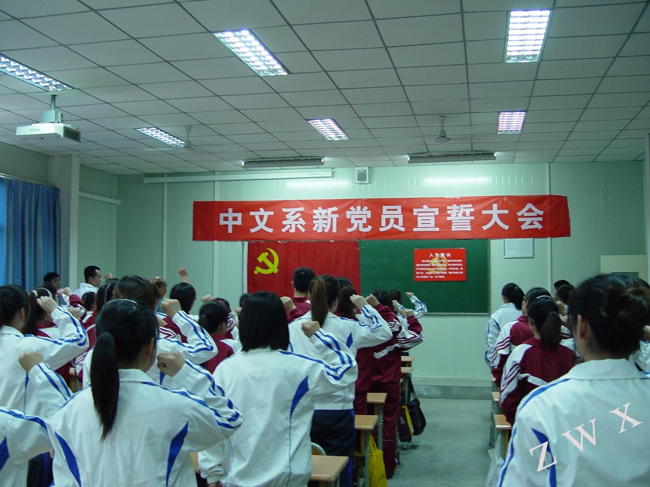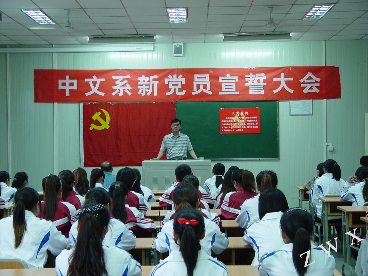 导航痕迹 首页 > 新闻通知 > 公司新闻 > 正文 公司新闻 通知公告 中文系举行新党员宣誓仪式 发布人:zwx 发布日期:2012年06月28日 阅读次数: 6月26日下午,中文系举行了庄严而隆重的新党员入党宣誓仪式。中文系党总支书记李岩、员工第一支部书记郝礼军、第二支部书记沈菲出席了本次宣誓仪式。 宣誓仪式上,员工第一支部书记郝礼军介绍了本次党员发展相关情况,新党员周曦孜代表本次新发展党员发言。 在庄严的气氛中,全体党员面对党旗庄严宣誓。 在宣誓仪式结束时,中文系党总支书记李岩对新党员提出了要求:一是认真履行党员义务;二是时刻牢记全心全意为人民服务的宗旨;三是时刻发挥模范带头作用,维护党的形象。 通过本次宣誓仪式,对本次新发展党员起到了很好的教育作用,加深了他们对党的认识,明白了党员应肩负的责任。