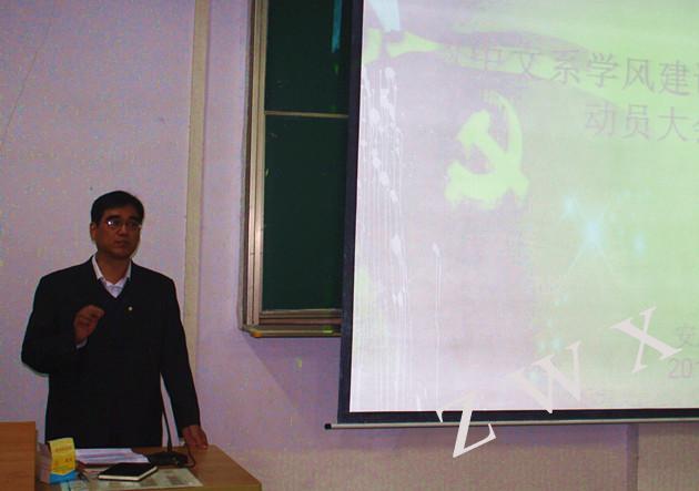 2014年10月26日晚,中文系在1510教室召开“学风建设示范岗”动员大会。中文系党总支书记李岩、员工党支部书记郝礼军、全系入党积极分子、发展对象、员工党员130余人参加了动员会。会议由员工党支部书记郝礼军主持。