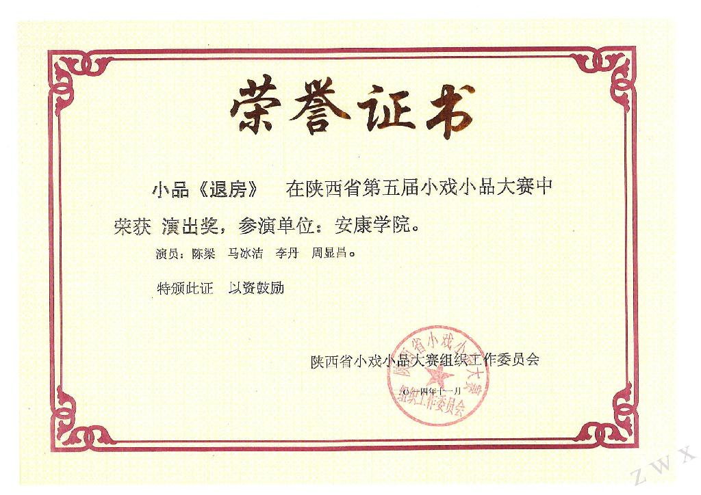 11月21日晚,陕西省第五届小戏小品大赛在陕西省艺术研究院落下帷幕。公司中文系影视戏剧社师生编排的话剧小品《退房》,荣获组织奖、演出奖、导演奖三个奖项。这是继去年《小芹的郎河》在校园戏剧节获得多项奖励之后,再次获得的省级戏剧表演艺术奖项。