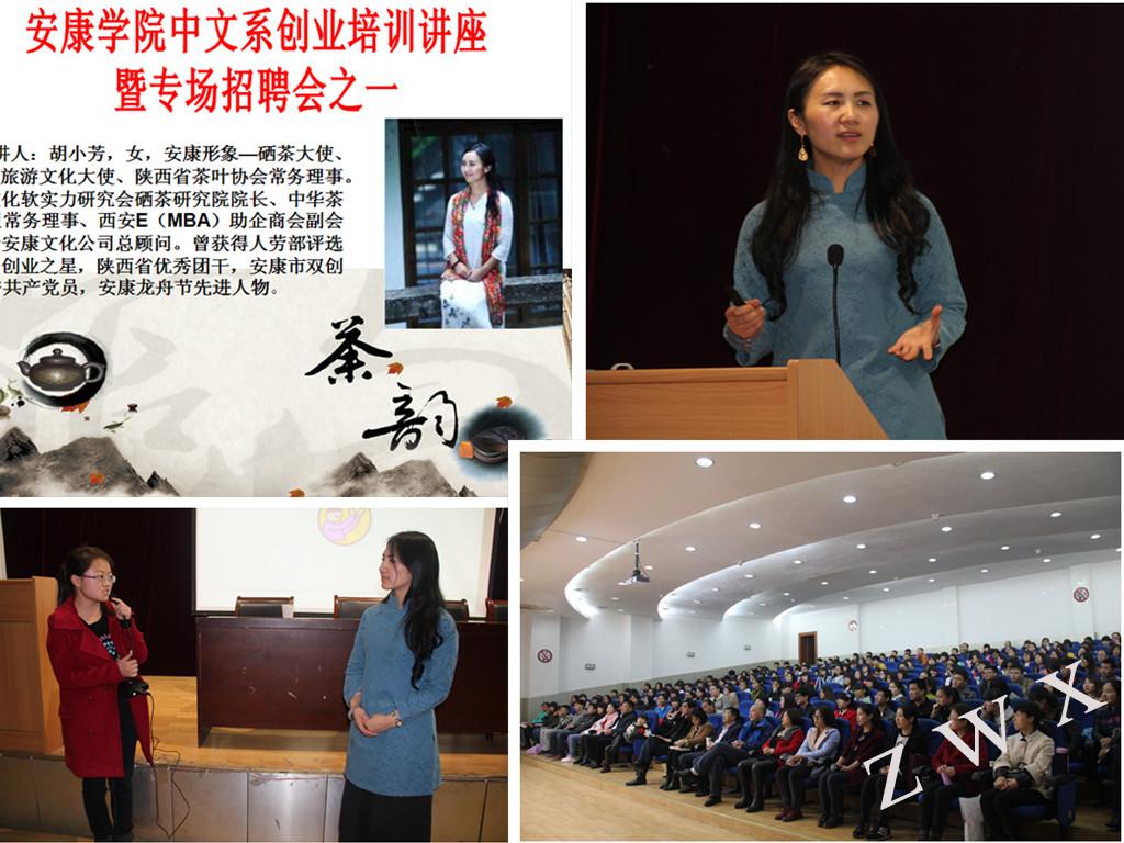 2015年3月19日,中文系在一号教学楼六楼报告厅举办了一场创业培训讲座暨专场招聘会。安康形象大使、陕西省茶叶协会常务理事、硒茶研究院经理胡小芳老师就如何创业与同学们进行了交流。老安康饮食文化有限公司、马非马商贸有限公司、安康丰业电子商务有限公司进行了现场招聘。中文系党总支书记李岩,学工办主任郝礼军,辅导员邹棠华、艾全霞、沈菲以及二百余名员工参加了本次讲座及招聘活动。