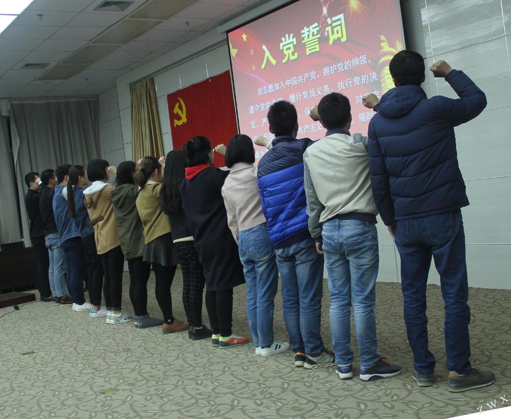 仪式开始,全体肃立,奏唱国际歌。接着,赵罗飞等新发展的十三位新党员上台,在邹棠华同志领誓下,面对党旗庄严宣誓。