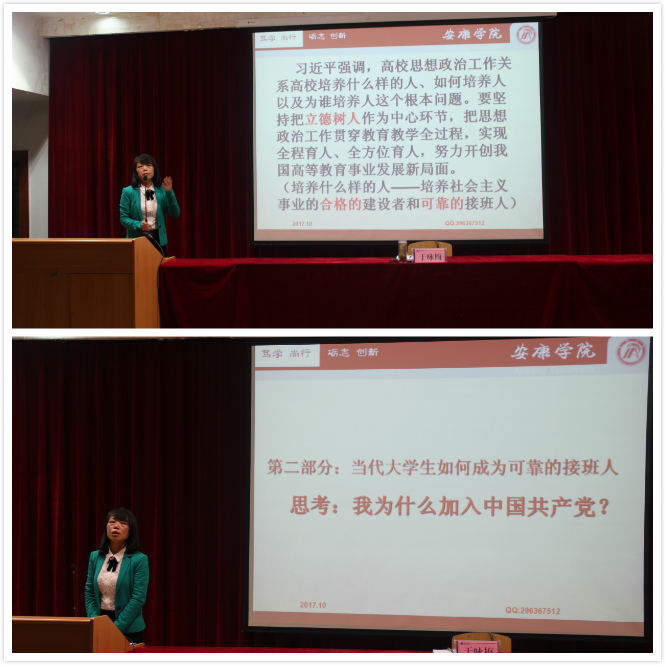 在随后的讲座中,于书记首先从习近平总书记在全国高校思想政治工作会议上的讲话精神引入,她指出,围绕立德树人的中心任务,高校应该培养社会主义事业的合格的建设者和可靠的接班人,本次讲座重点讲如何培养“可靠的接班人”。讲座内容分为两个部分。第一部分围绕“党的十八大以来砥砺奋进的五年”这一主题,从中国共产党为什么能、中国特色社会主义为什么行和中国梦为什么会实现三个方面进行了细致讲解。她强调习近平总书记发出“始终同人民想在一起、干在一起”的号召是中国共产党率领人民实现中国梦的政治本色和力量源泉,是以习近平同志为核心的党中央治国理政的鲜明政治本色,是“中国之治”的政治密码,也是建设中国特色社会主义的必然要求和实现人民共同富裕、促进人的全面发展的保障,是实现中国梦不竭的动力源泉。第二部分围绕“当代老员工如何成为可靠的接班人”这一主题,从中国共产党从哪里来、谈谈信仰和说说党章三个方面进行阐述,重点引导员工学习党的基本理论知识,不断端正入党动机,坚定共产主义理想信念。最后,于咏梅对加入党组织的具体流程以及如何撰写入党申请书进行讲解,鼓励员工积极递交入党申请书,争取早日成为一名入党积极分子。并告诫全体员工“现在,青春是用来奋斗的;将来,青春是用来回忆的。”