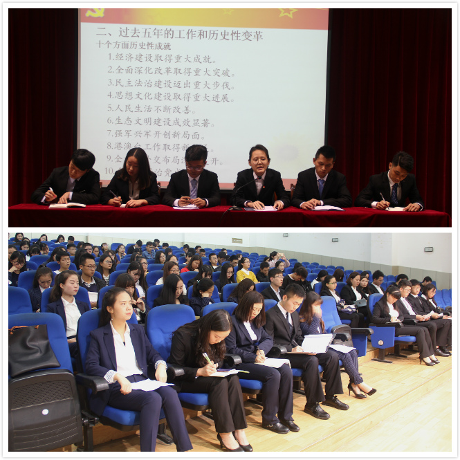 本次会议分为两个部分,分别为十九大报告学习分享会和员工干部工作例会。会议伊始,全体起立齐唱团歌,团总支副书记、员工会主席田乃玉围绕“不忘初心,牢记使命”的主题对十九大报告进行了详细解读,分别从党在过去五年的工作和历史性变革、习近平总书记在十九大上强调的一个重要判断、一个历史使命与四个伟大、习近平新时代中国特色社会主义思想和基本方略、两个重要时期、九个方面理论分析和政策指导六个方面进行具体阐述。最后,她用习近平总书记在十九大上对中国当代老员工的要求作讲话结尾:当代老员工应尊师重教,学会创新,倡导创新文化,坚定理想信念,聚天下之英才,青年兴则国家兴!自觉做共产主义远大理想和中国特色社会主义共同理想的坚定信仰者和忠实实践者。