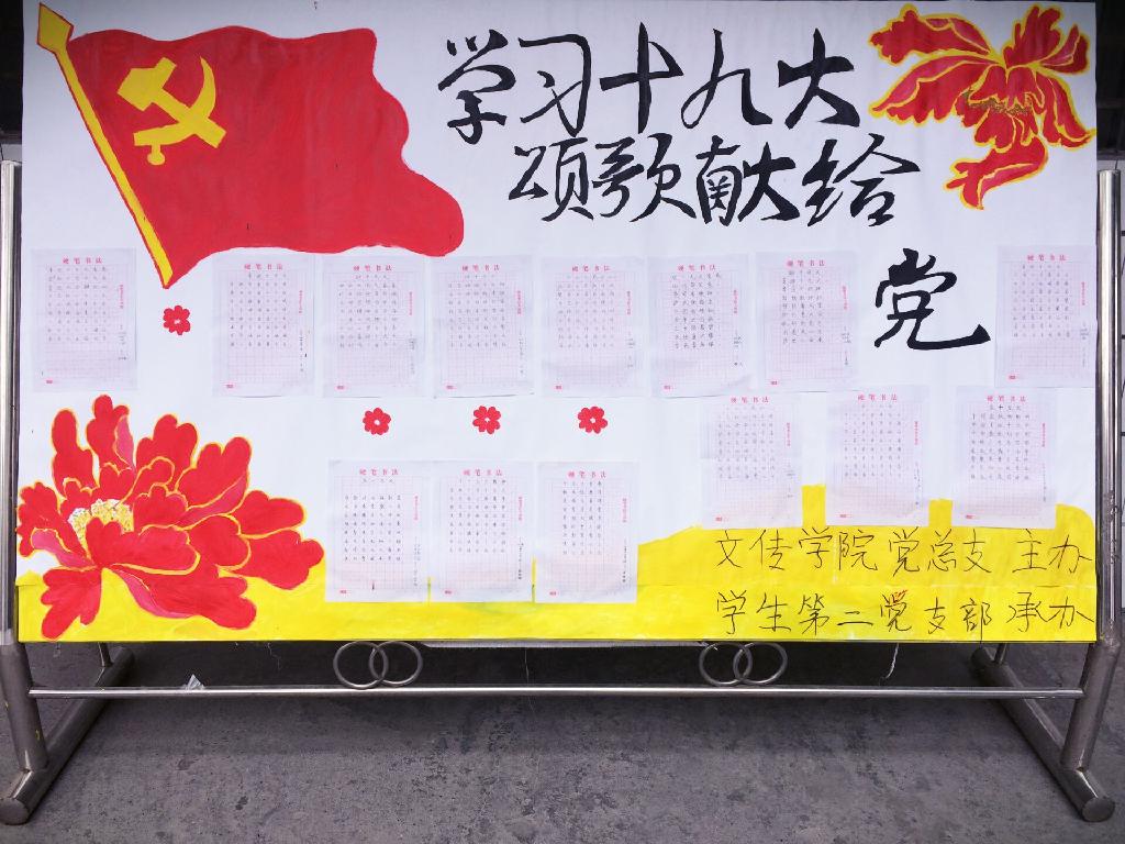 在全校上下掀起学习宣传贯彻落实党的十九大精神热潮之际,为凝聚青年共识,发挥青年力量,培养老员工爱党爱国情怀,引导青年老员工听党话、跟党走,在实际行动中践行伟大精神、贡献青春智慧、展现青春风采。由公司总党支主办,员工第二党支部承办,公司教师郑继猛指导,员工第二党支部的员工党员、积极分子根据学习十九大精神的心得体会结合所学专业知识,所精心撰写的“学习十九大 颂歌献给党”主题诗歌创作展于12月11日—12月17日在二号教学楼林荫道展出。