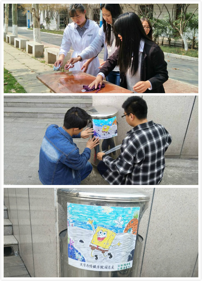 3月24日公司青年志愿者服务队在香溪路口组织开展交通文明劝导活动,引导市民安全有序穿行马路。3月25日在校园内开展“美化垃圾桶,让垃圾回家”志愿活动,对图书馆门口以及二号教学楼前林荫道周围的所有垃圾桶进行了美化。此次活动将参与人员分为两组,各小队找到相应的垃圾桶,手持抹布,清洗桶身,并贴上公司同学所创作具有创意的雷锋月主题的图画。原本普通的垃圾桶变得有趣生动,图画上的标语也提醒着同学们将垃圾扔进垃圾桶,改掉乱扔垃圾的恶习,让“低碳、绿色、文明”的环保理念深入人心。