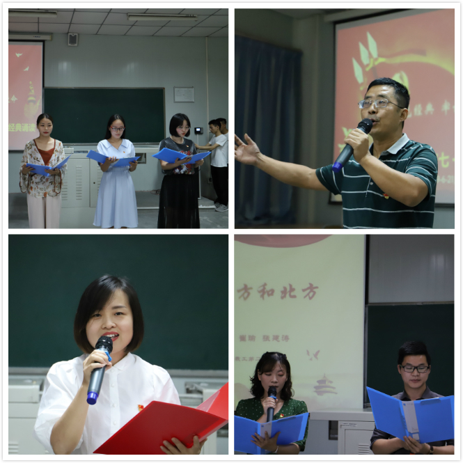 经典诵读环节,员工第一、第二党支部员工党员,教工第一、第二党支部倾情准备13个团体或个人诵读节目,员工们饱含激情的诵读了《有一首歌》《青春中国》《祖国啊,我亲爱的祖国》《颂五四,传屈骨》《七月的天空》《七一献歌》《我的祖国》《七一颂歌》《党旗颂》等经典诗歌、诗词和散文,深情地歌唱了《我和我的祖国》等经典爱国歌曲;教师崔瑜和张建涛诵读的《我的南方和北方》,李婷诵读的方志敏《可爱的中国》,邹棠华诵读的《毛泽东诗三首》将活动推向了高潮。诵读内容虽题材各异,但都声情并茂地表达了对党的崇高敬意和革命理想信念的坚定不移,铿锵有力,振奋人心,诵读者激情昂扬,听者热血澎湃,深深激发了全体师生的爱国热情。
