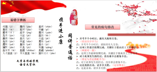 除上述三项主要内容外,语言文字社还推出了易错字、病句类型解析推普展板,意在给经过展板的师生传达正确的普通话认识及推广普通话的重要性。