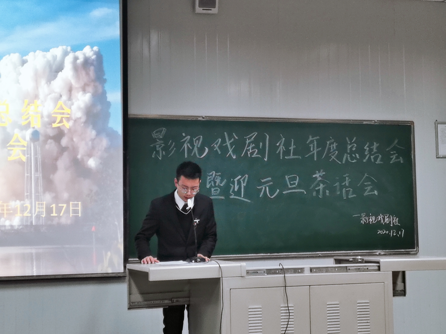 随后,影视戏剧社社长梁少华进行了社团活动年度总结报告,带领大家总结过去,展望未来。他从社团的各项工作和成果及社团工作中的问题两方面做了总结汇报,并表达他对剧社工作的信心,同时他鼓励社团成员积极参与今后的活动,希望社员在剧社有所得,有所获。