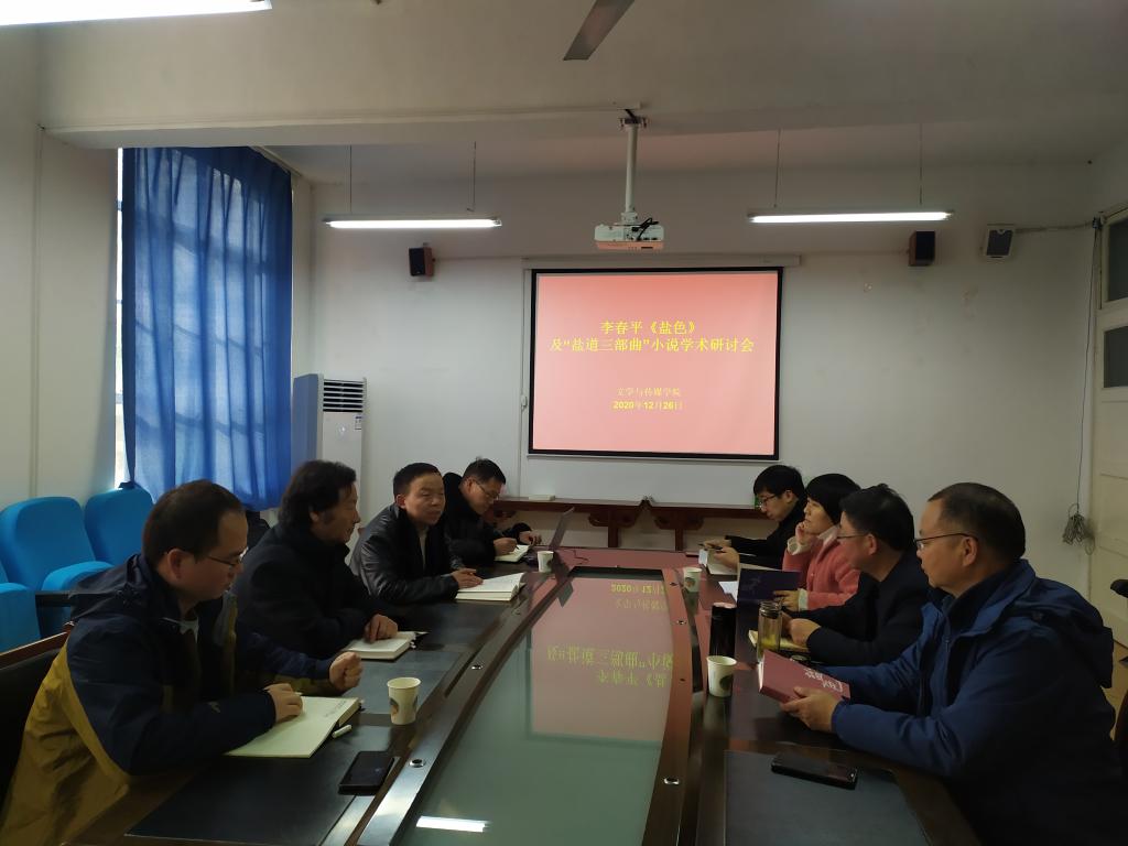 杨经理讲话之后,与会教授和博士围绕《盐色》及“盐道三部曲”的思想和艺术成就,进行了深入交流和探讨。郑继猛教授以“《盐色》的当代价值”为题,探讨了《盐色》对秦巴乡贤文化的挖掘,以及这种挖掘对当代乡村文化振兴的启示价值;周龙田副教授以“无意的忽略:《盐色》的叙事选择”为题,探讨了《盐色》在革命叙事和土匪叙事上的匠心和特色;韩文霞副教授以“‘盐道三部曲’:特异的历史叙事”为题,分析了李春平历史叙事中的日常生活描写,高度肯定了李春平小说对秦巴地域文化的挖掘;曹刚博士以“‘盐道三部曲’的小说美学特征”为题,运用温克尔曼“平淡的崇高、静穆的伟大”观点,分析了《盐色》及“盐道三部曲”的形式美学特征及其当代价值;谭诗民博士以“李春平小说的承与变”为题,分析了“盐道三部曲”对传统小说的继承,及其在空间叙事上的创新拓展;雷升录副教授以“李春平的小说世界”为题,从故事讲述和民间立场两个角度,分析了“盐道三部曲”的艺术特色;崔德全博士以“声音和《盐色》:《盐色》的象征”为题,分析了《盐色》中的词牌名标题与小说思想内容的象征勾连。
