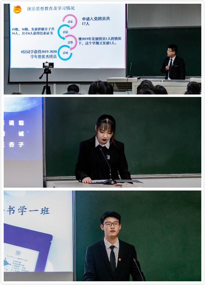 答辩班级依照年级顺序,依次用PPT、短视频的表现形式展示了本班风采,分别从思想建设、组织建设、学风建设、学习模式、班级荣誉、班级特色活动等六个方面对入校以来班级建设的总体情况作以汇报展示,各个班级讲述着过去一年中班级取得的各项成绩,充分展示了班集体的亮点和成长收获。