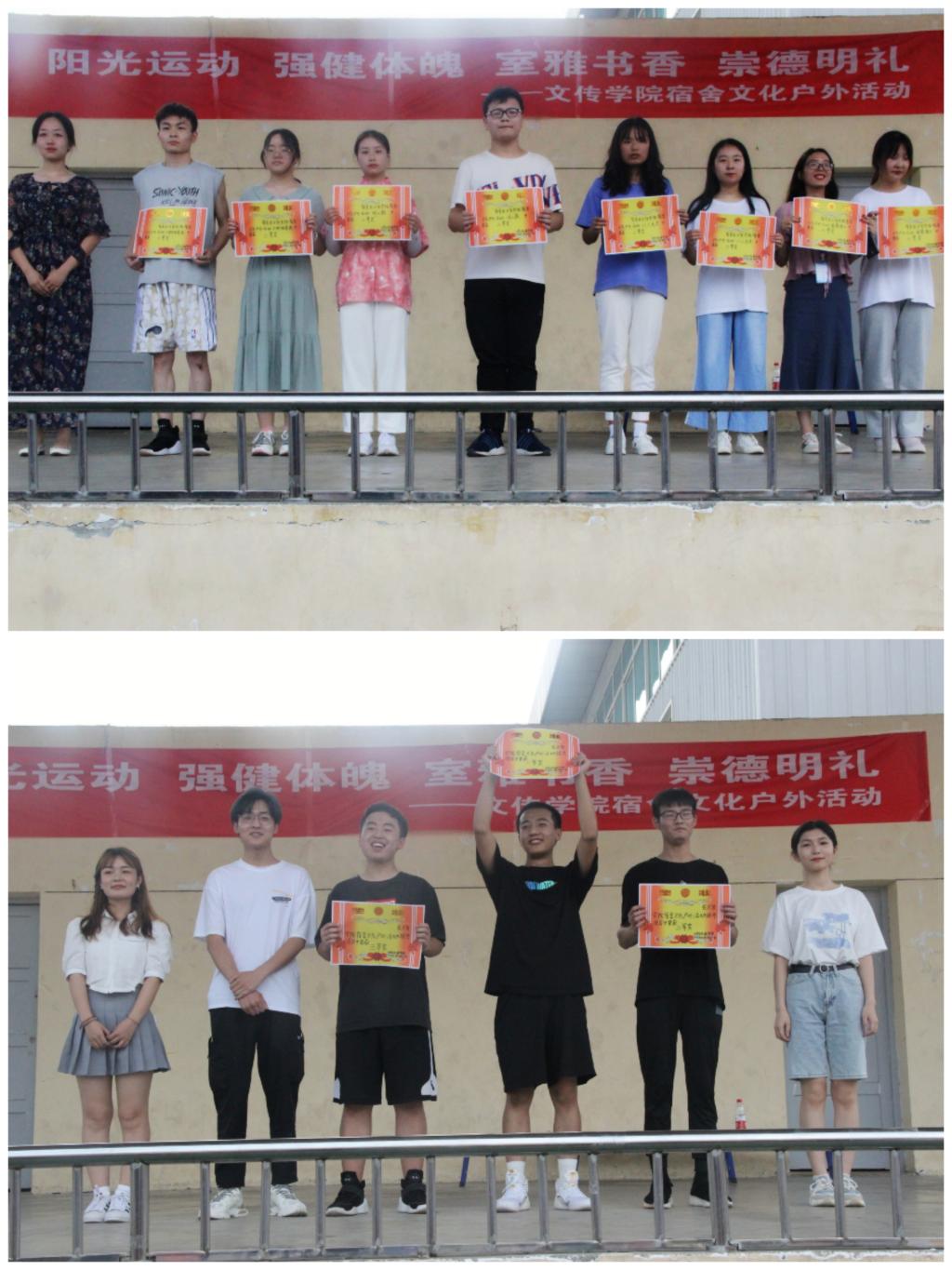 本次宿舍文化户外活动共包含五个项目:“同心鼓”、“大脚板竞速”、“八人九足”、“能量传递”、拔河比赛。其中“同心鼓”、“大脚板竞速”、“八人九足”、“能量传递”以宿舍外单位报名参赛,拔河比赛以班级为单位报名参赛。比赛过程中,各团队参赛选手们团结协作、全力以赴。经过紧张有序的比赛,各比赛项目都顺利完成。主持人宣布了比赛的最终成绩,并为获奖宿舍颁发了荣耀证书以及精美奖品。
