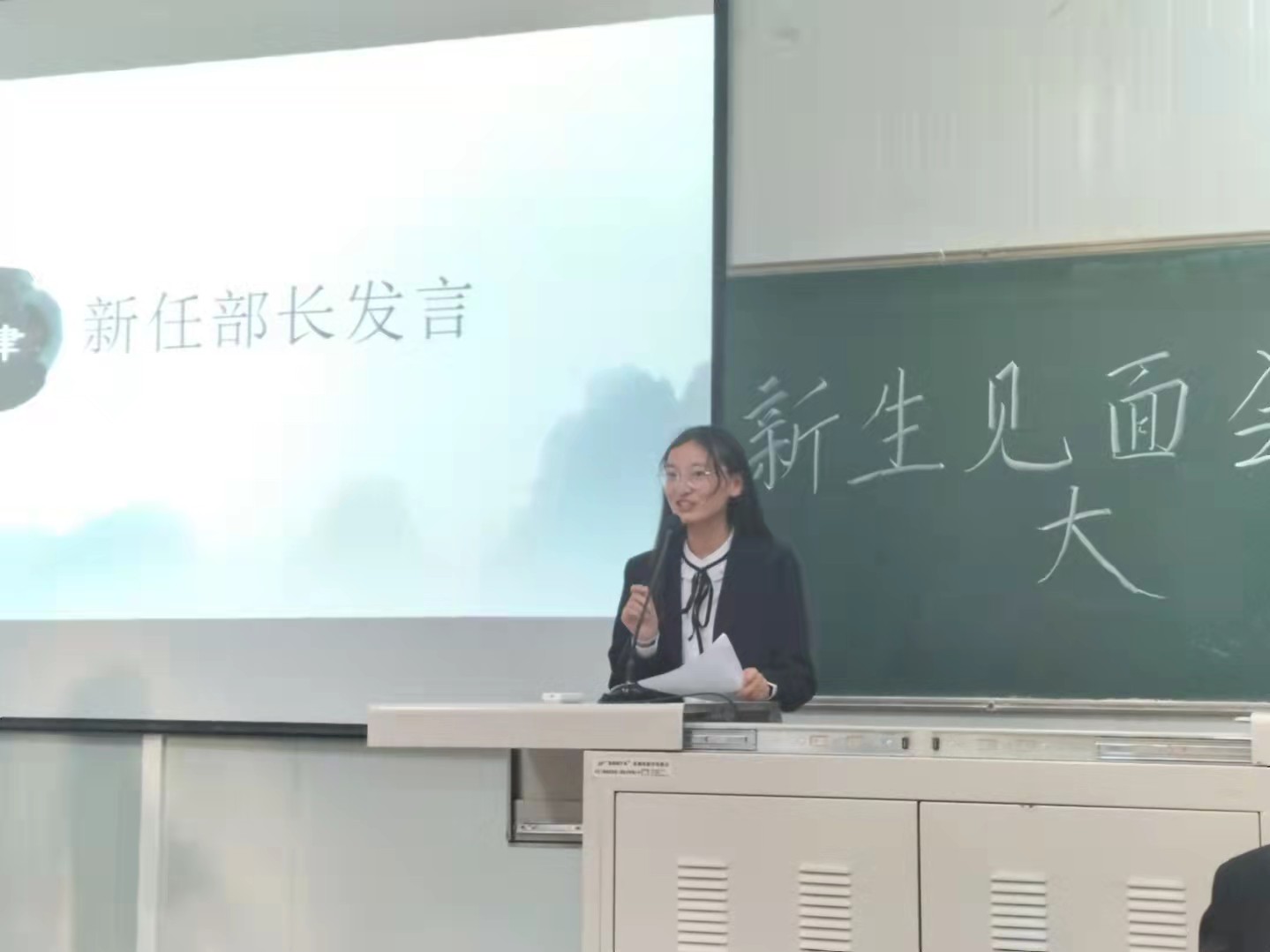 前任社长王思蓉对上一届社员的整体学习以及社团活动情况做了基本总结,就存在的问题给出了具体建议,同时她期望社团中的每个人都能学有所获,学有所成。新任社长马子涵说明了书法练习时需要注意的事项,以及理应遵守的纪律卫生方面的问题,同时也表达了对于各部门干事的期待和勉励。新任各部长上台发言,简单介绍了本部门的服务事项,让大家对于书法社活动有了进一步的了解。部长们分别对新的社员表示热烈欢迎,希望每个社员以及干事在其位谋其职,他们的肺腑之言获得了热烈的掌声。