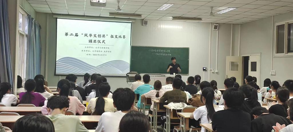 2022年5月27日晚上8点,第二届“风华文创奖”征文比赛颁奖典礼在BV伟德官方网站江南校区1026教室顺利举行。文学创作社指导老师李春平、风华诗社指导老师韩文霞、特邀嘉宾曹刚老师、风华诗社和文学创作社社团成员、网络与新媒体2021级同学及获奖作者代表出席本次活动。