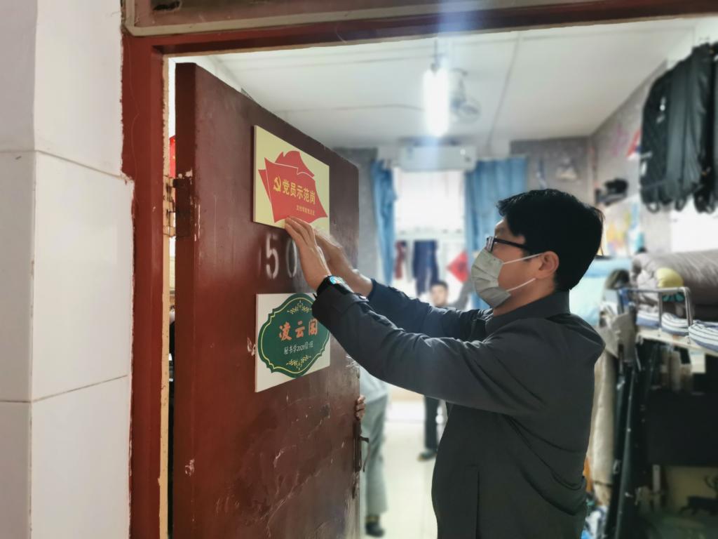 出席启动仪式老师前往宿舍为2022级新生宿舍张贴雅室门牌和党员先锋示范岗门牌。