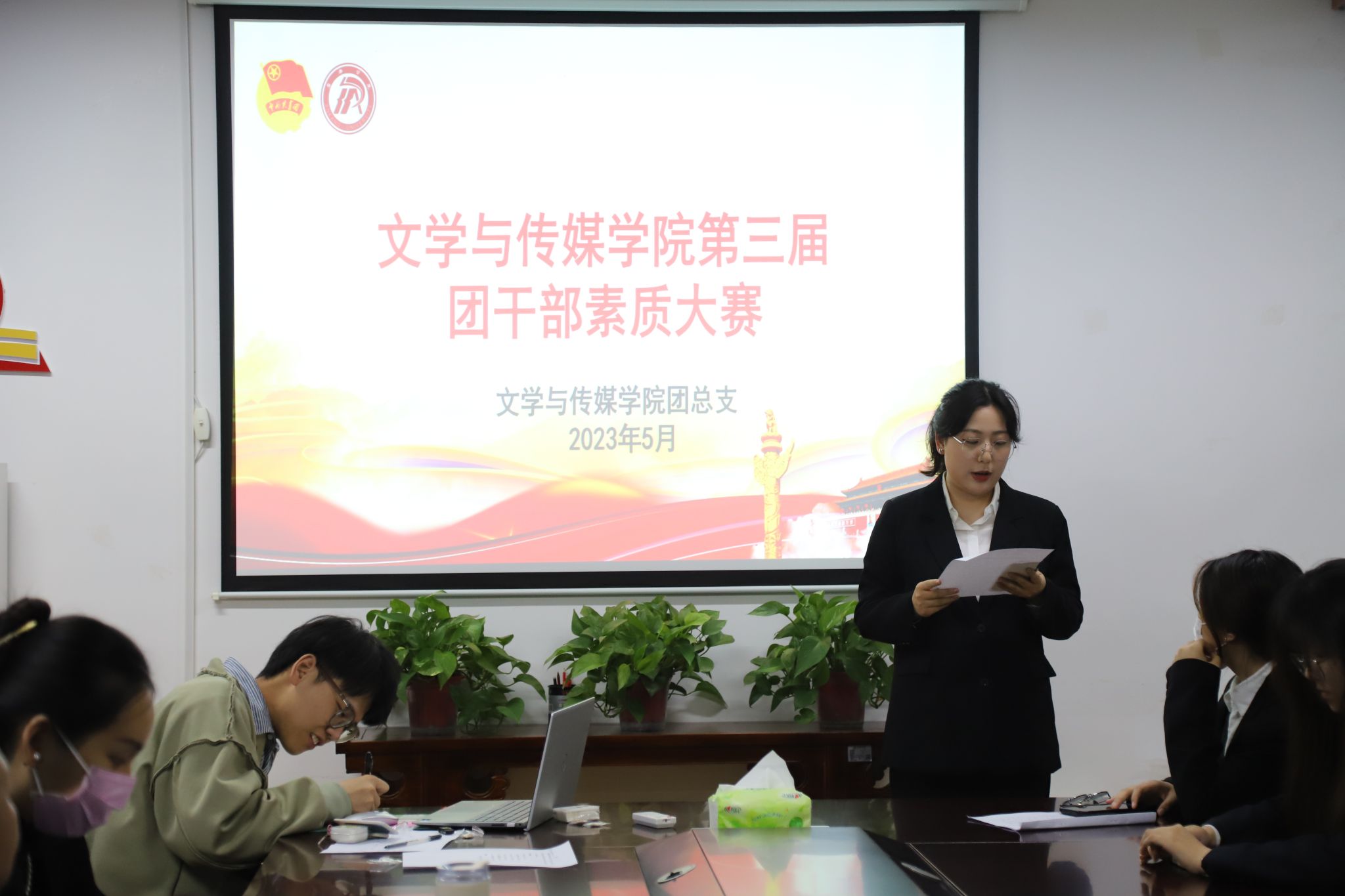 为深入贯彻学习习近平新时代中国特色社会主义思想,落实党的二十大精神,不断提升我院团干部思想政治工作理论水平、专业素养和工作能力。公司于2023年5月8日晚上7点在2307教室开展第三届团干部素质能力大赛。公司党总支副书记杨海蓉、团总支书记彭潇和辅导员李欣逸担任此次大赛评委,公司21、22级全体团支书参加比赛。