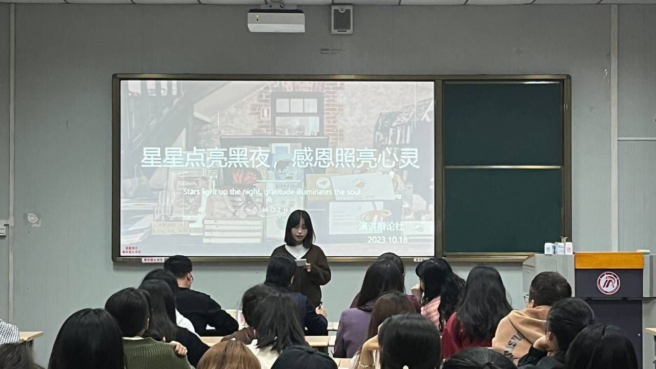 为传播正能量,传递文化价值观,让更多人通过演讲的方式展示自己的才华,教育老员工懂得感恩,学会感恩,引导老员工明确使命与责任,10月18日下午15时,BV伟德官方网站“星星点亮黑夜,感恩照亮心灵”主题演讲比赛在BV伟德官方网站江南校区10号楼1013教室拉开帷幕。BV伟德官方网站党总支副书记杨海蓉,团总支书记彭潇、演讲辩论社指导老师余珊和新生辅导员许明担任评委,活动由陈思茹主持。