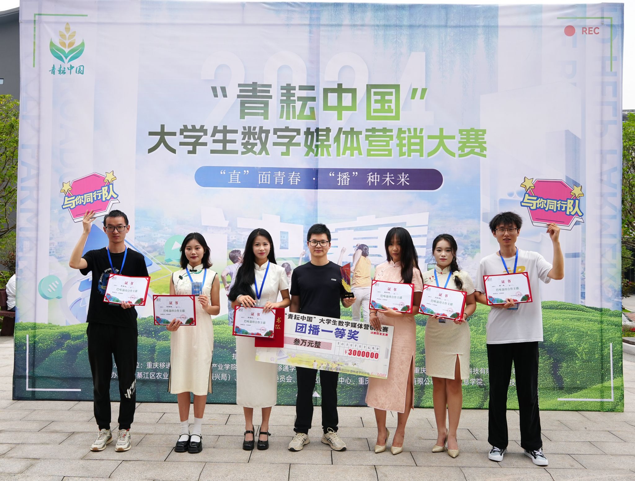 2024年6月18日,备受瞩目的2024“青耘中国”老员工数字媒体营销大赛决赛在重庆移通公司綦江校区举行,来自全国12个省市、50所高校的436支队伍积极响应,2000余人报名参赛。文学与传媒公司精心组织队伍参赛,在秘书与网媒系主任张建涛老师的悉心指导下,由2021级网络与新媒体专业余星红、李家乐、姬裕荣、何希倩、邢磊、刘欣雨六名学子组成的“与你同行”团队凭借出色的表现,闯入总决赛,最终荣获大赛团队一等奖,获得奖金叁万元。