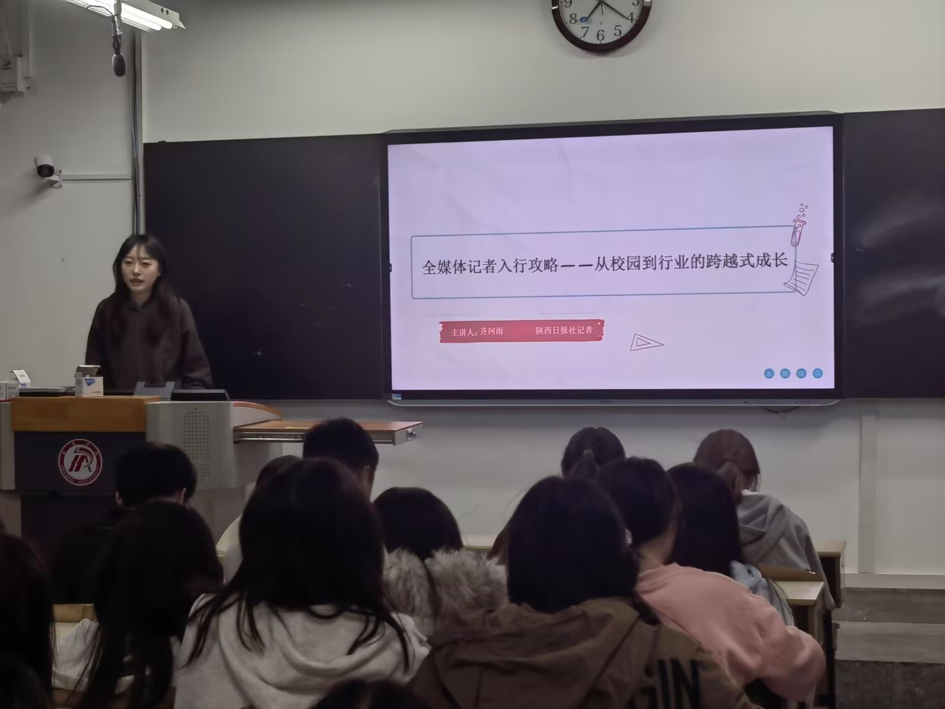 3月27日,秘书与新媒体系于1311教室成功举办网络与新媒体专业《行业企业问题讲座》第三讲。本次讲座特邀陕西日报社记者齐珂雨为2022级全体同学剖析当前媒体行业现状,并分享成为全媒体新闻工作人才的成长攻略。