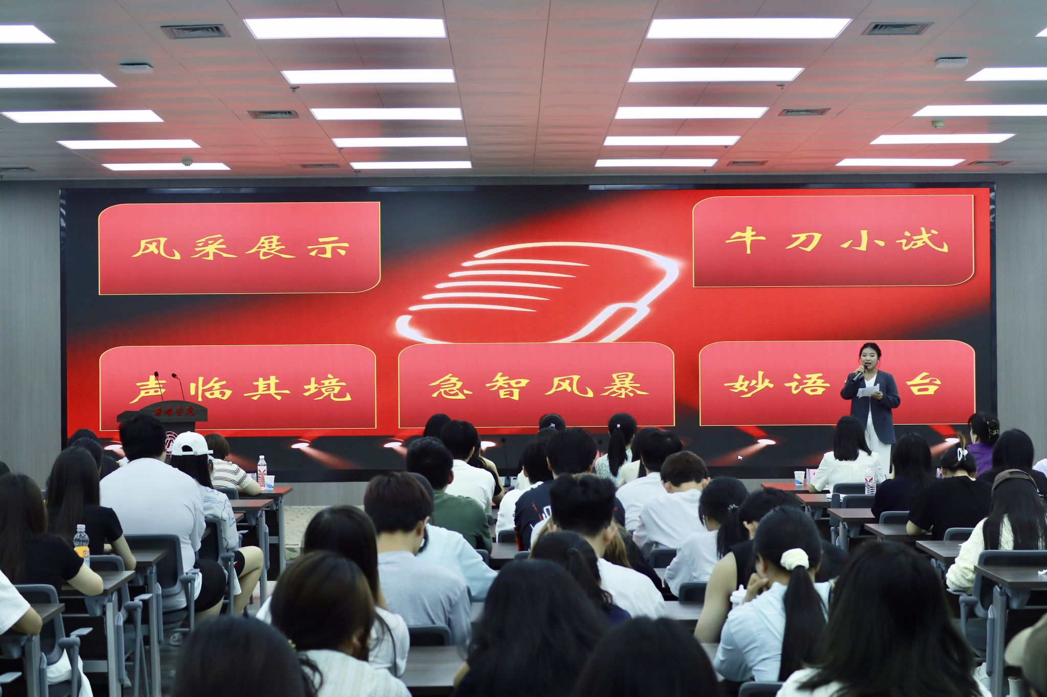 本次大赛共有来自经管公司、农生公司等7个公司的25位选手参加,经过初赛的严格选拔,最终12位选手进入决赛。决赛共设置了五大环节全面考察选手综合素养,包括展现个性魅力的“风采展示”、彰显主持创意的“牛刀小试”、考验临场功底的“声临其境”抽题展示、检验急智反应的“急智风暴”无稿主持,以及聚焦专业思辨的“妙语擂台”评委问答。选手们在各环节中轮番亮出“十八般武艺”,表现出扎实的语言功底与舞台掌控力。