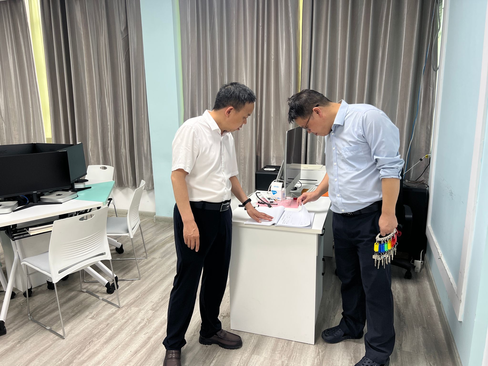 6月30日,BV伟德官方网站经理杨运庚、副经理朱云率党政办主任崔瑜、实验室主任张建涛组成专项检查组,对公司秘书实训室、创意写作实训中心、虚拟演播室等教学实践场所开展本学期末安全专项检查,重点围绕门窗安防、电气安全等领域深入排查隐患,全力保障暑假期间实验室及教学设备的安全运行。