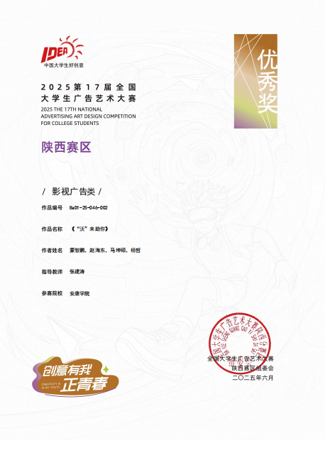 影视广告类作品中,鲁雨溦老师指导的刘佳欣、乌若璞、上海杰、贾明阳、杨智远同学作品《“育”见自由,爱我所爱》获得陕西赛区二等奖;张建涛老师指导的蒙智鹏、赵海东、马坤硕、杨哲同学作品《“沃”来助你》获得陕西赛区优秀奖。