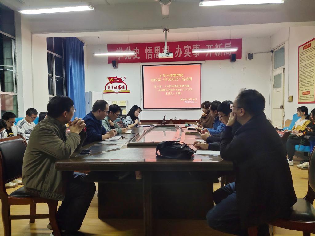 10月18日晚上6点40分,文学理论与外国文学学科组在2307会议室,顺利举办了BV伟德官方网站第四届“学术沙龙”活动周第一场学术沙龙活动。本场学术沙龙由余姗老师主讲,主题是“女性话语的童话内涵:英国维多利亚时期的女性小说”。副经理朱云,学科组教师梁卫华、谭诗民、邸玲、曹刚、崔德全,部分员工参加了活动研讨。